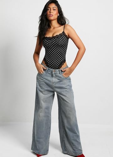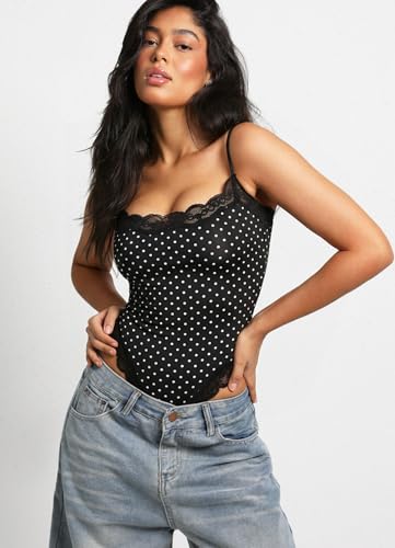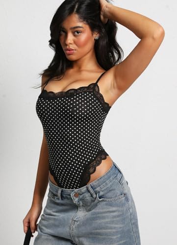 Navneet Women Sexy Lace Bodysuit Lace Trim High Cut Thong Spaghetti Strap Cami Bodysuit Going Out Tank Tops Body Suit