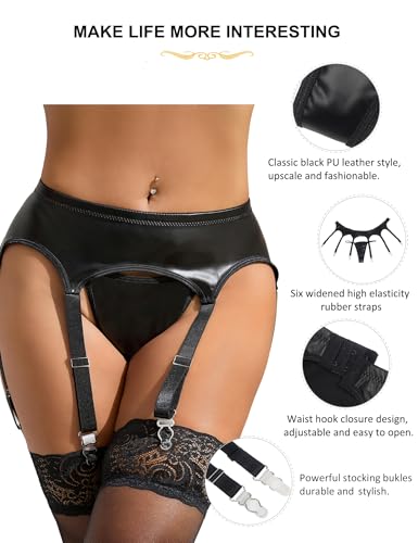 ohyeah Black Faux Leather Garter Belts 6 Strap Metal Clip Suspenders for Thigh Highs Stockings (with Sexy G-String Thongs)