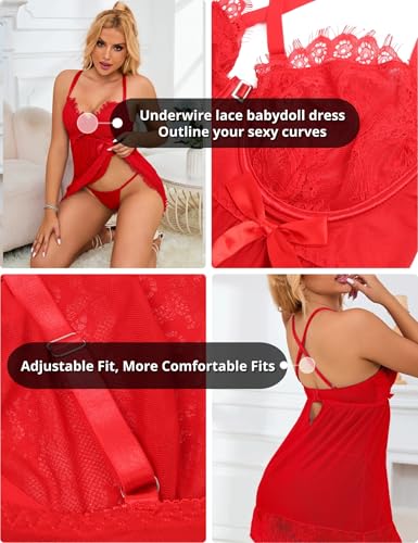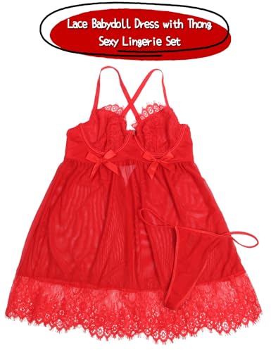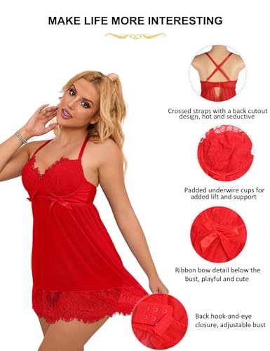 ohyeah Sexy Lingerie Dress Set for Women Underwire Lace Babydoll Teddy Lingerie Mesh Nightgown Full Slip Mini Boudoir Outfits