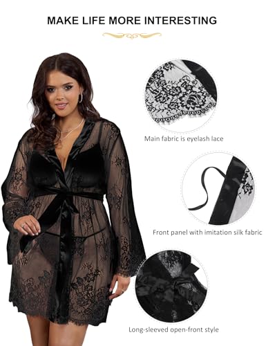 ohyeah Women Black Lace Kimono Robe Plus size Lingerie Robe Sheer Mesh Chemise Nightgown Babydoll Lace Lingerie
