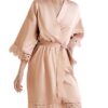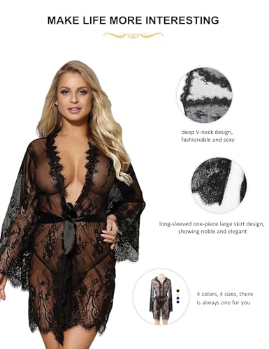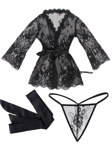 ohyeah Women Kimono Sheer Mesh Robe Sexy Eyelash Lace Long Sleeve Short Nightgown Cover Up With Thong Tulle Robe Set