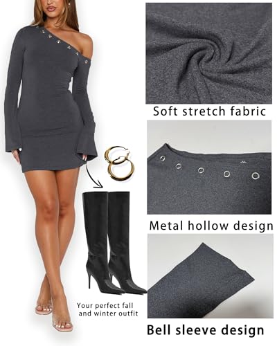 One Shoulder Dresses for Women Metal Ring Sexy Flared Long Sleeve Bodycon Going Out Club Party Y2K Mini Dress