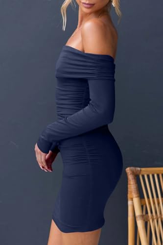 OWIN Women’s Fall Off The Shoulder Ruched Bodycon Mini Dress Long Sleeve Ribbed Knit Fitted Club Party Dresses