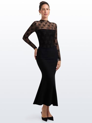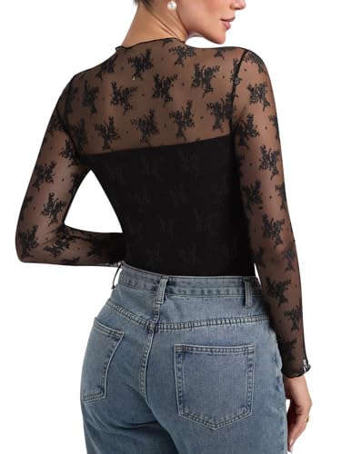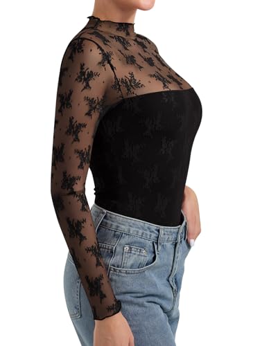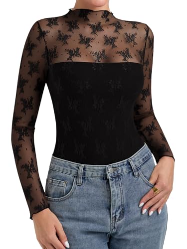 PINKMSTYLE Women’s Lace Mock Neck Long Sleeve Bodysuit – Sheer Sexy Fall Outfits for Going Out,Date Night,Country Concert