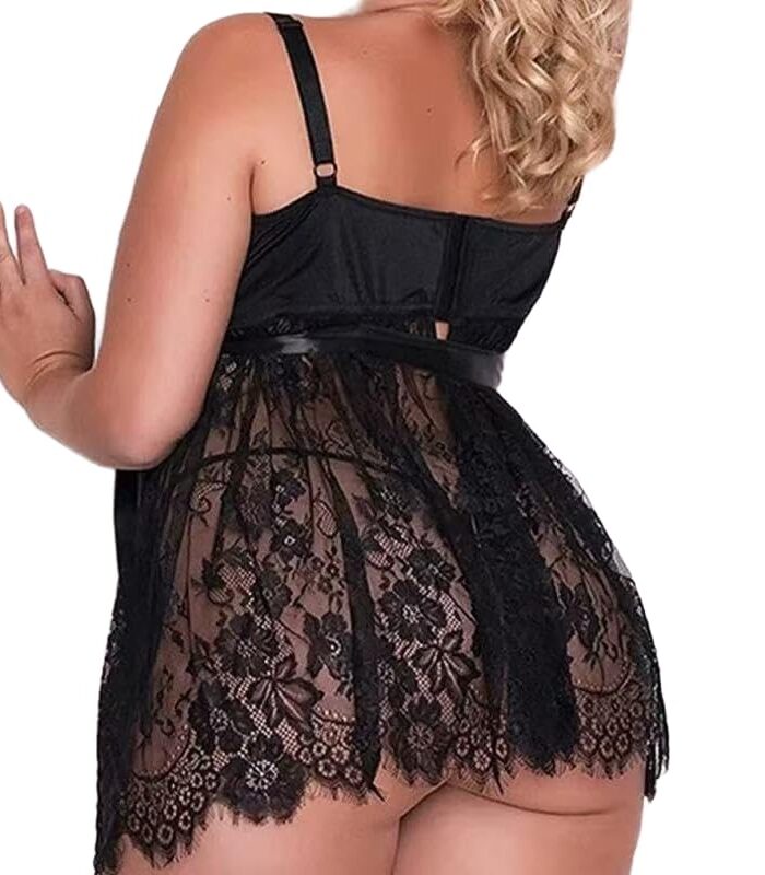 Plus Size Women Sexy Lingerie Set Curvy Lingerie Lace Babydoll Mesh Chemise Nightgown Boudoir Sleepwear with Panty, Black