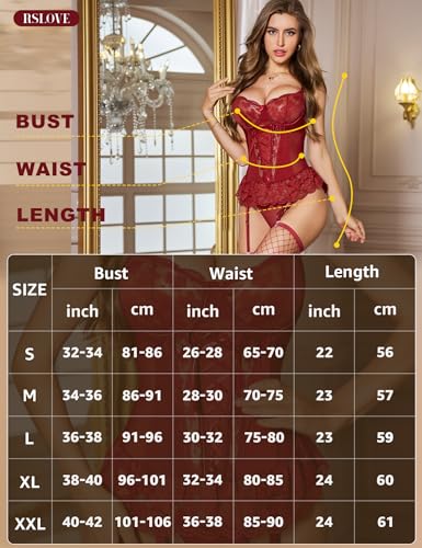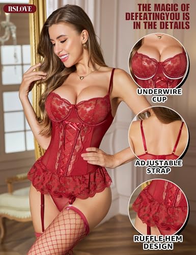 RSLOVE Lingerie Sets for Women Sexy – Lace Corset Bodysuit with Garter Belts Underwire Naughty Babydoll Rave Outfits