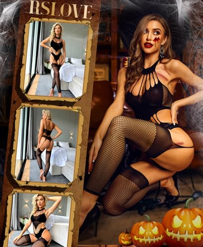 RSLOVE Women Fishnet Bodystocking Lingerie Sexy Footless Stockings Sleeveless Lace Bodysuit Halterneck One Piece Pantyhose