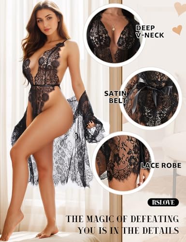 RSLOVE Women Sexy Bridal Lingerie Set – 2 Piece Lace Robe with Sheer Teddy Bodysuit for Wedding Night Honeymoon Anniversary