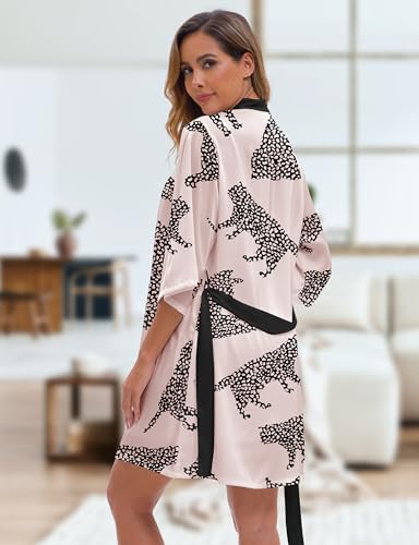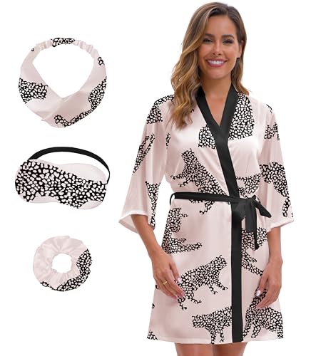Satin Robe for Women Print Short Silky Kimono Robes Lightweight Summer Bathrobe with Eye Mask Headband Hair Tie