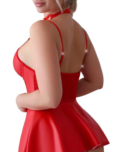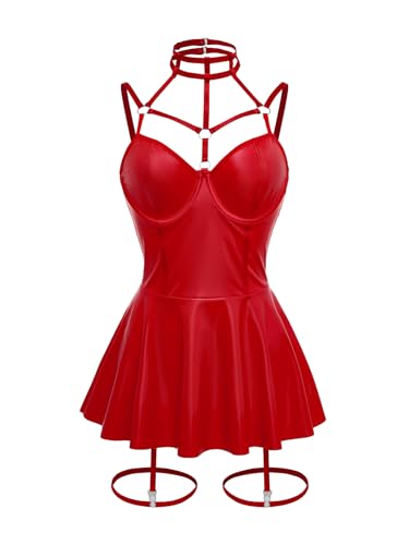 Sexy Strappy Leather Underwire Choker Garter Belt Mini Lingerie Set Dress with Thong 3 Piece