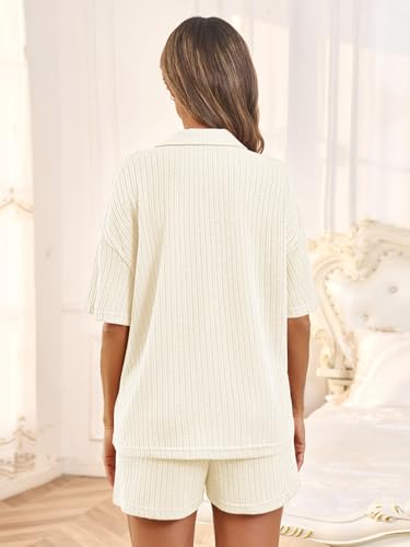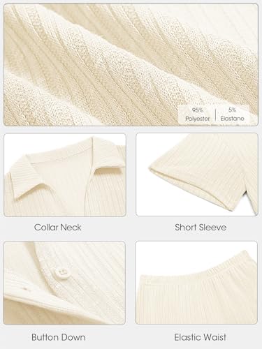 Tankaneo Womens Ribbed Knit 2 Piece Pajama Sets Button Down Short Sleeve Tops and Shorts Set Summer Casual Loungewear
