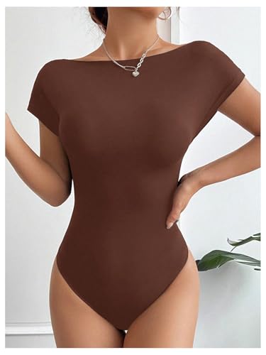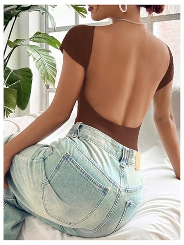 WDIRARA Women’s Sexy Backless Bodysuit Leotard Cap Sleeve Boat Neck Body Suits Tops