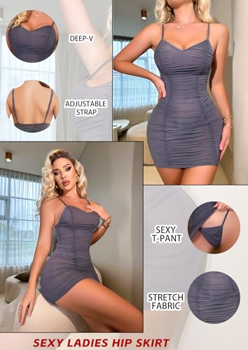Women Chemise Lingerie Sexy Babydoll Sleepwear Satin Nightgown V Neck See Through Mini Teddy Dress Plus Size Grey