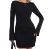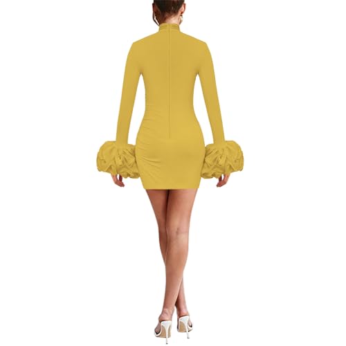 Women Long Puff Sleeve Mini Dress, Ruched Bodycon Mock Neck, Sexy Cocktail Party Dress