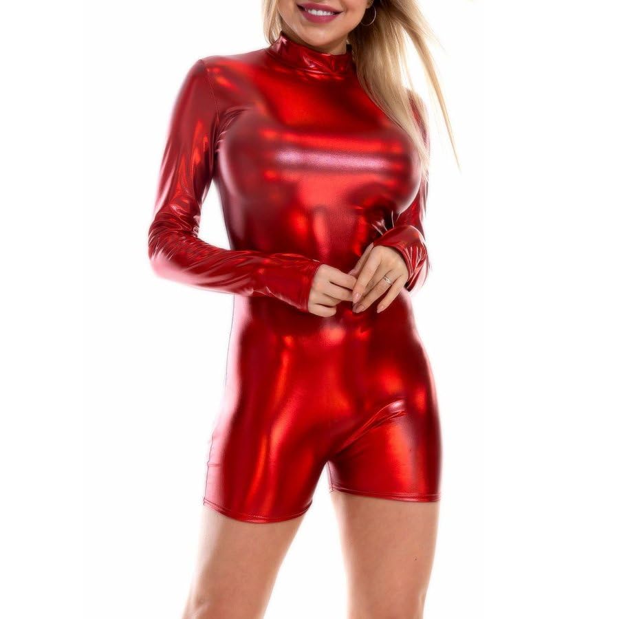 Women Long Sleeve Holographic Metallic Romper Jumpsuit Shiny Thumb Hole Zipper Back Jumpsuits Disco Rave Outfits