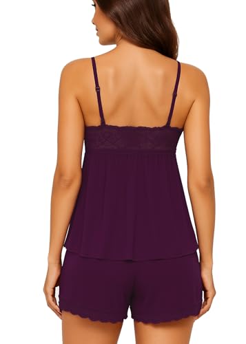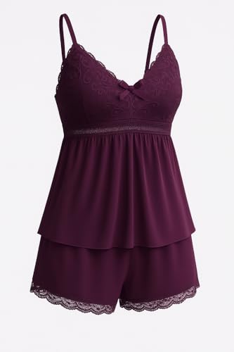 Women Pajama Set Lace Trim Short PJ Set V Neck Sleeveless Sleepwear Drawstring Waist Nightwear