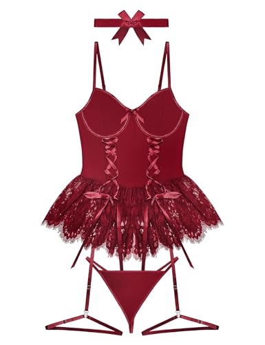 Women Sexy Lingerie Set Naughty Lace Up Corset Bodysuit Underwire Lingerie Babydoll With Garter Belt and Bow Tie