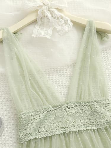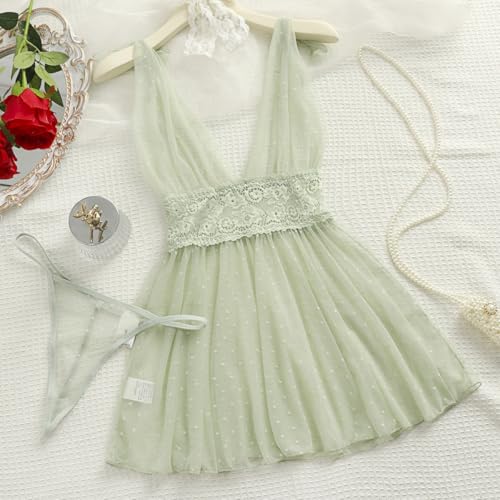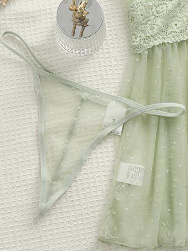 Women’s 2 Piece Polka Dots Lace Sheer Mesh V Neck Babydoll Teddy Sexy Sleepwear Nighty Nightwear Nightgown