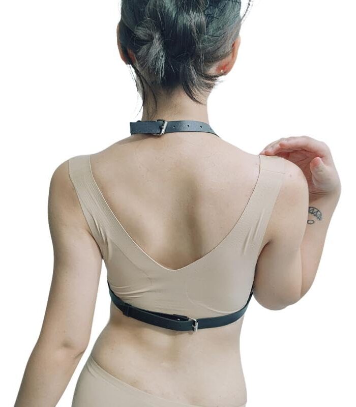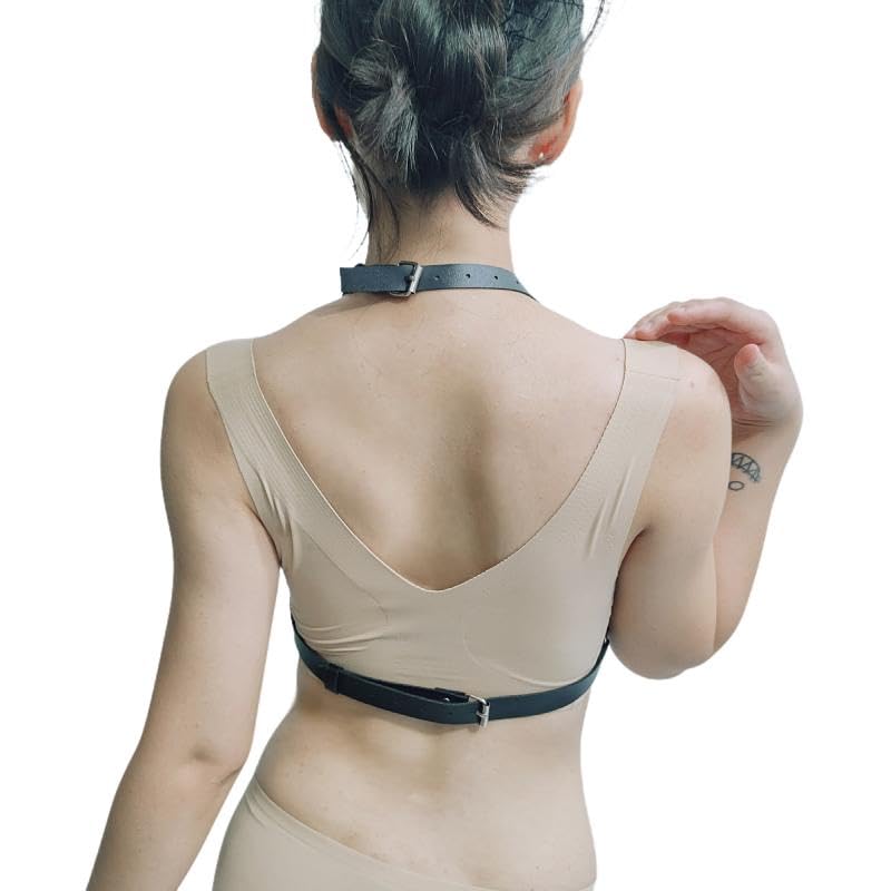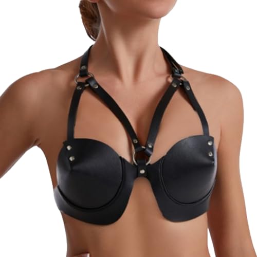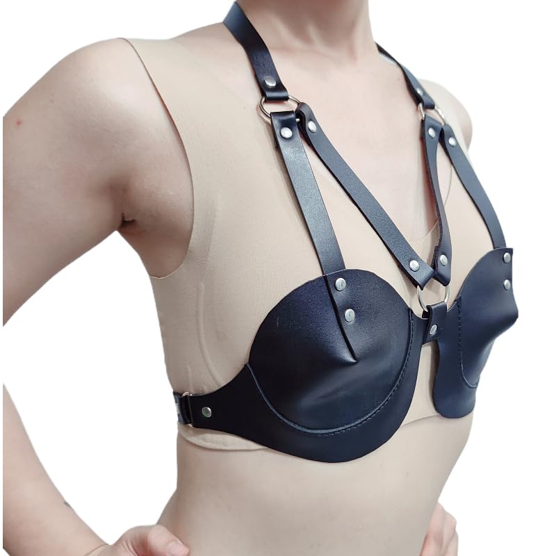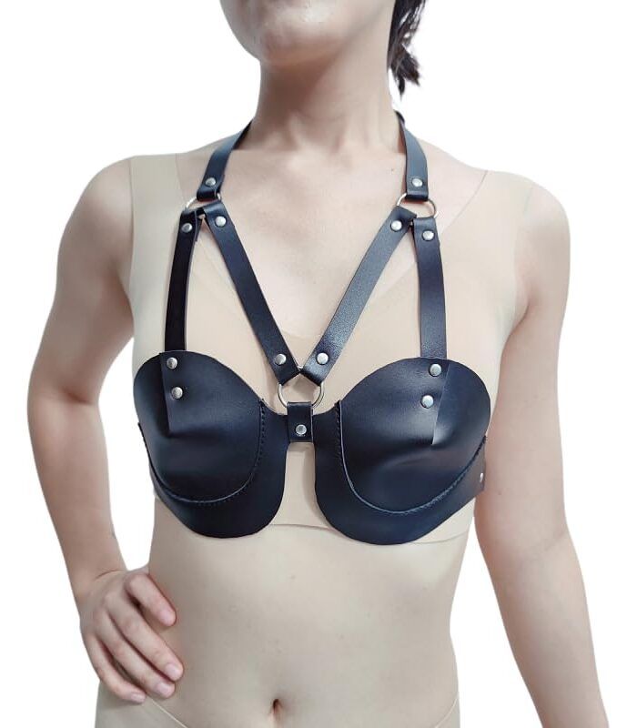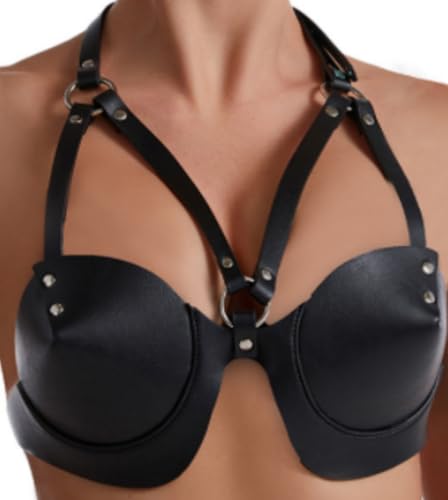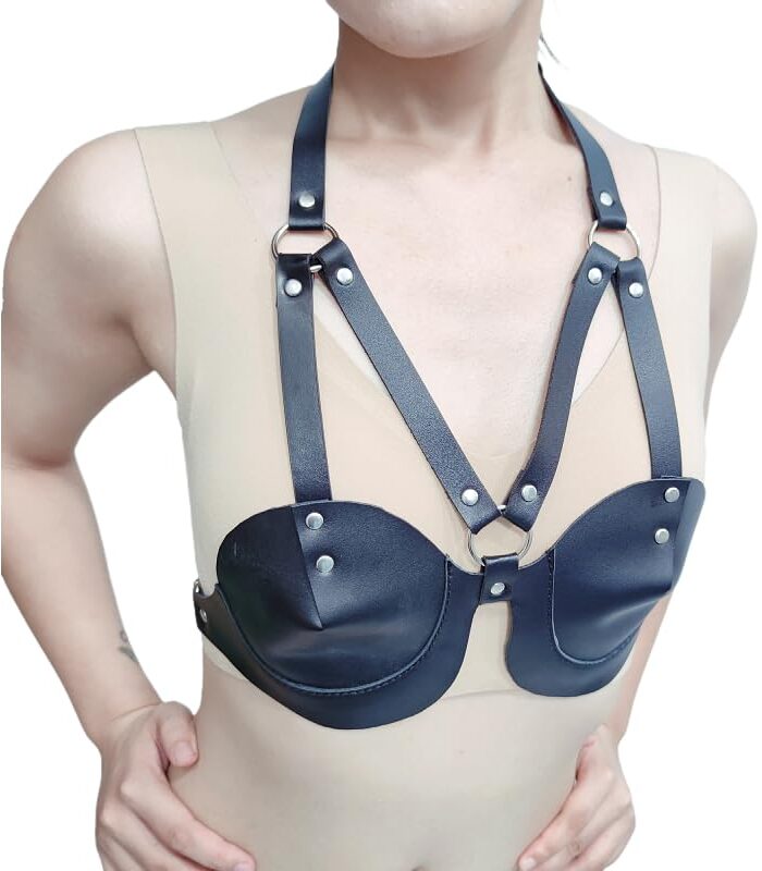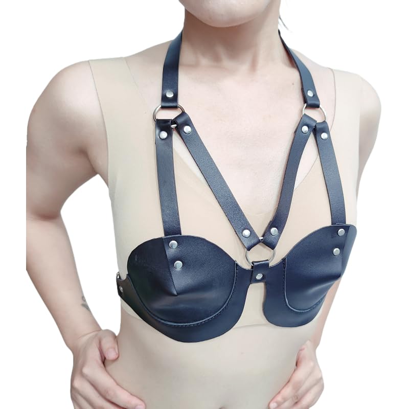 Command attention with this women’s faux leather harness bra, a bold alternative fashion piece designed to enhance your confidence and style. Crafted from durable vegan leather with metal accents, this sexy chest harness is both edgy and comfortable, making it perfect for fetish play, gothic styling, and daring clubwear ensembles.