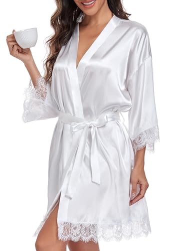 Women’s Lace Trim Kimono Robe Bride Bridesmaids Wedding Shower Satin Short Robe Bridal Party Nightgown