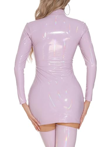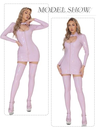 Women’s Leather Wet Look Latex Dress Long Sleeve U Neck Shiny Clubwear with Zipper