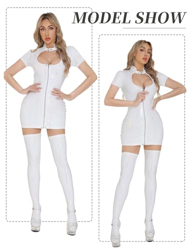 Women’s Leather Wet Look Latex Dress Short Sleeve U Neck Shiny Clubwear with Zipper
