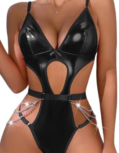 Womens Lingerie Faux PU Leather Lingerie Bra Cut Out Teddy Bodysuit Sexy Chains