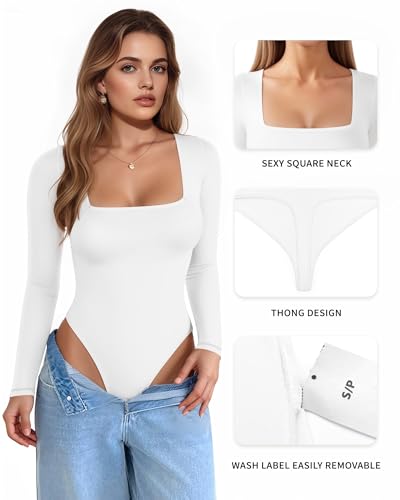 Womens Long Sleeve Body Suits Square Neck Thong Bodysuit Slim Shirts Sexy Fall Going Out Tops Y2K 2025