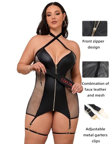 Women’s Plus Size Lingerie Set Leather Lingerie with Garter Set Sexy Sheer Babydoll Faux Leather Bodycon Dress