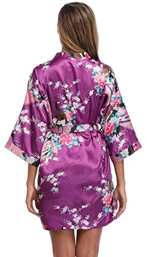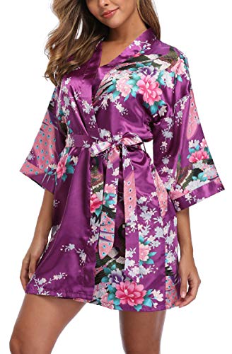 Women’s Satin Kimono Bathrobe Peacock and Blossoms Robes Soft Sleepwear Short Nightwear Dressing Gown