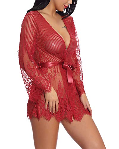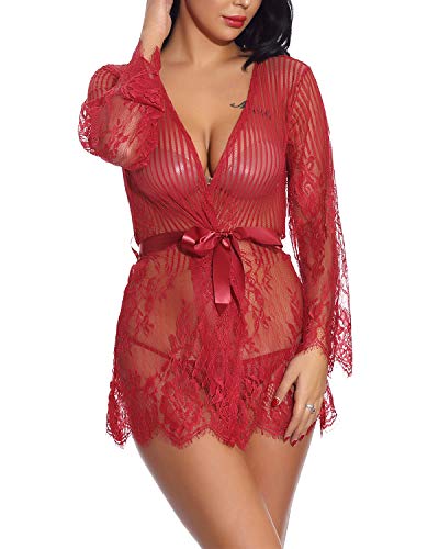Women’s Sexy Lace Kimono Robe Babydoll Lingerie Mesh Nightgown G-String (FBA)