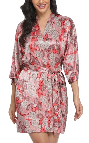 Yvipette Women’s Belted Satin Kimono Night Robe Sexy V-neck 3/4 Flounce Sleeve Silk Sleepwear